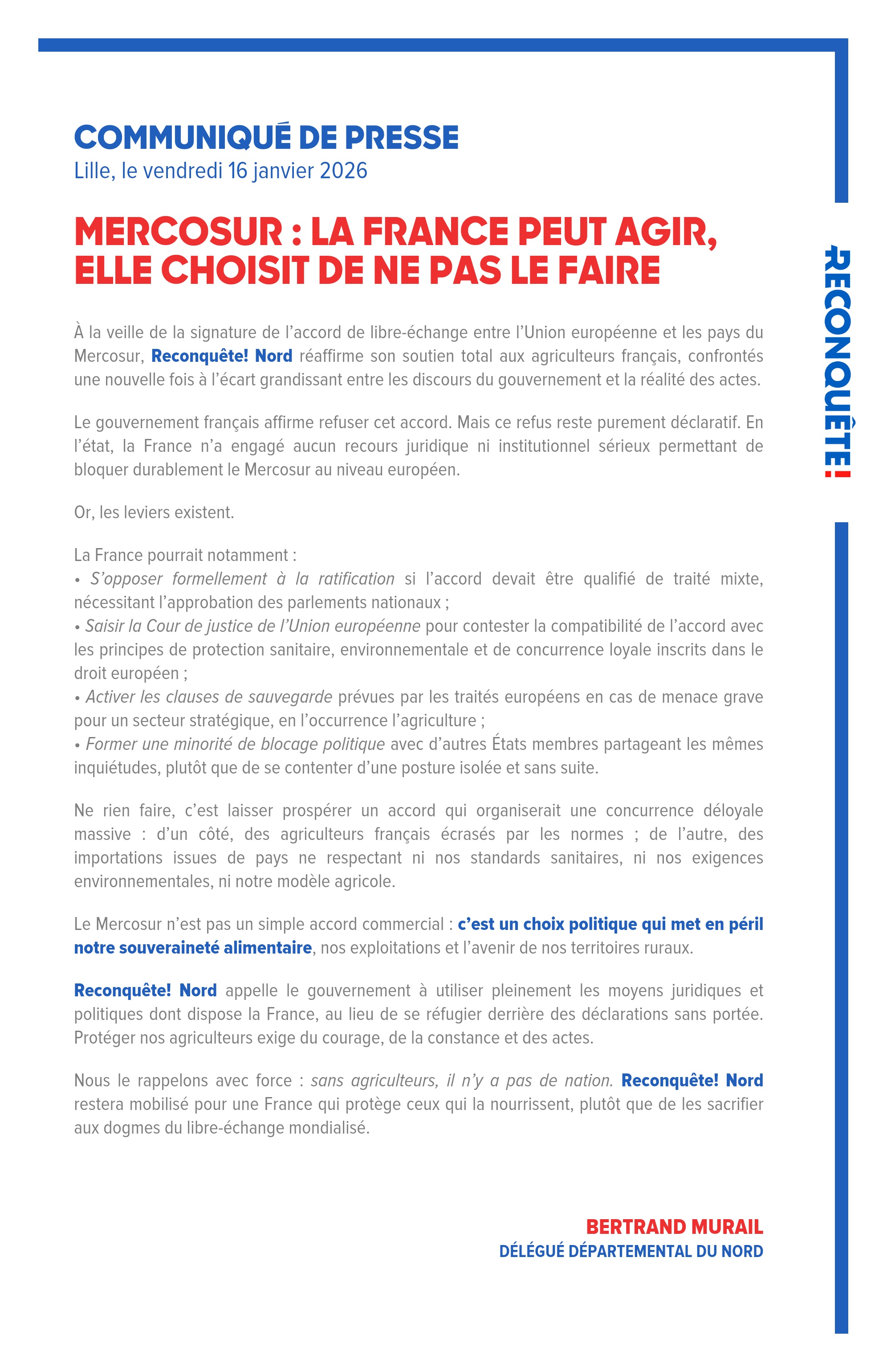 Reconquête! Nord appelle le gouvernement à utiliser pleinement les moyens juridiques et politiques dont dispose la France, au lieu de se réfugier derrière des déclarations sans portée. Protéger nos agriculteurs exige du courage, de la constance et des actes.
