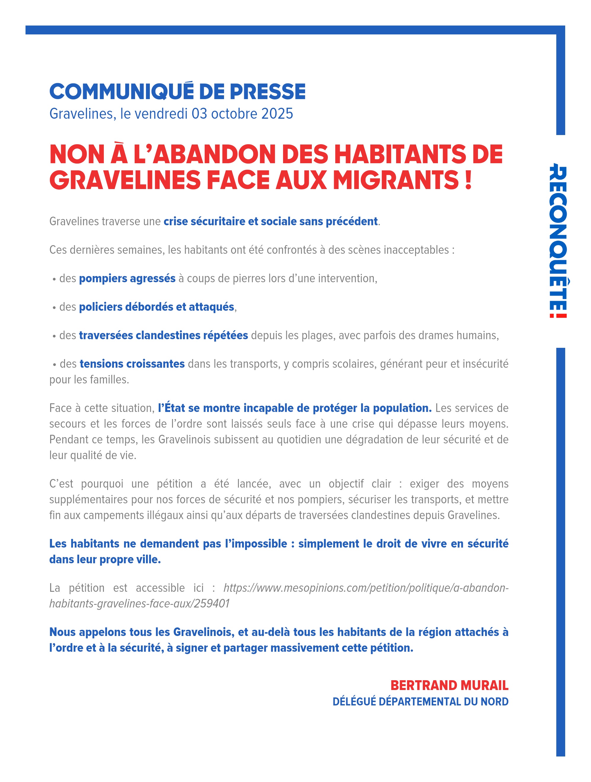 Nous appelons tous les Gravelinois, et au-delà tous les habitants de la région attachés à l’ordre et à la sécurité, à signer et partager massivement cette pétition.