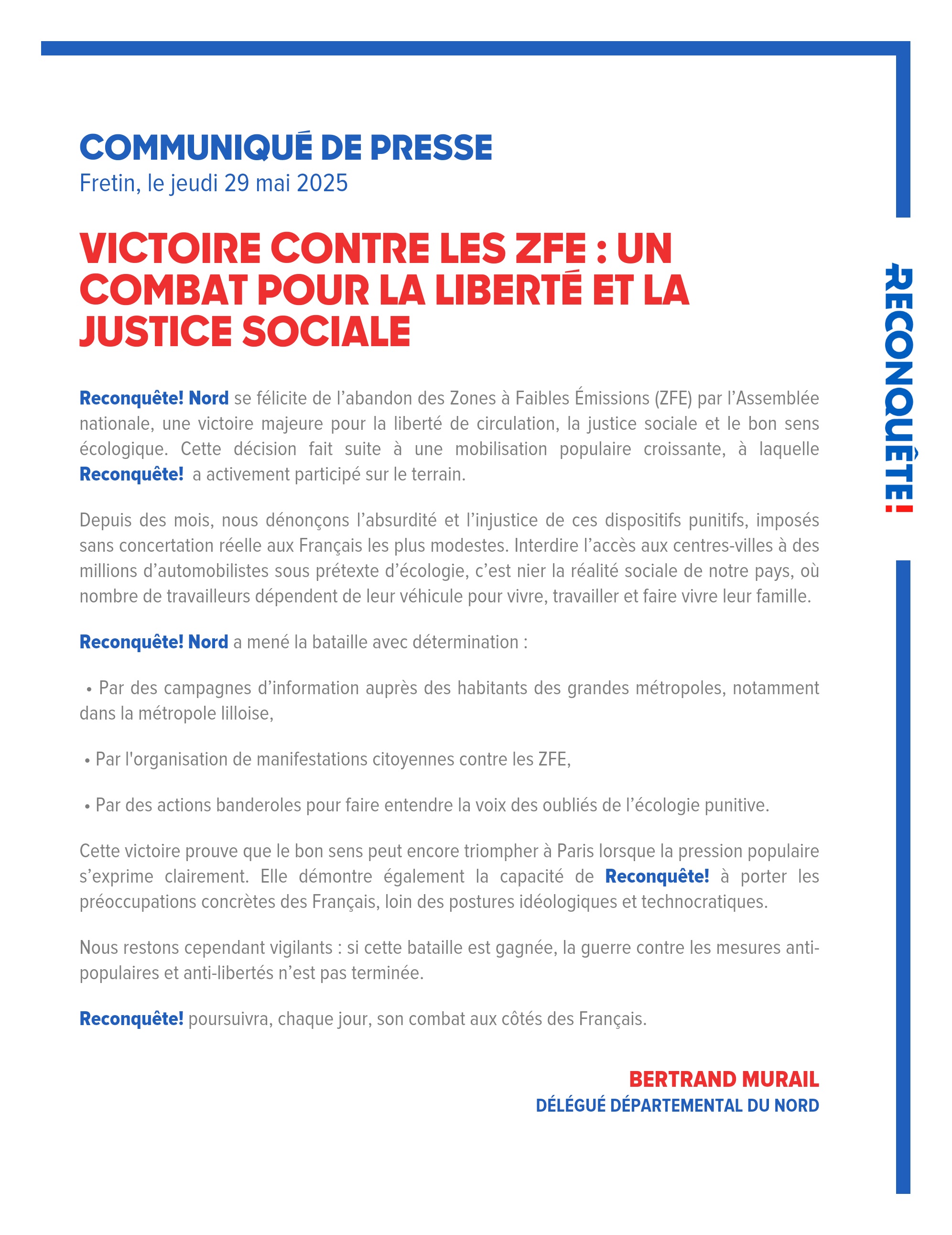 Reconquête! Nord se félicite de l’abandon des Zones à Faibles Émissions (ZFE) par l’Assemblée nationale, une victoire majeure pour la liberté de circulation, la justice sociale et le bon sens écologique. Cette décision fait suite à une mobilisation populaire croissante, à laquelle Reconquête! a activement participé sur le terrain.